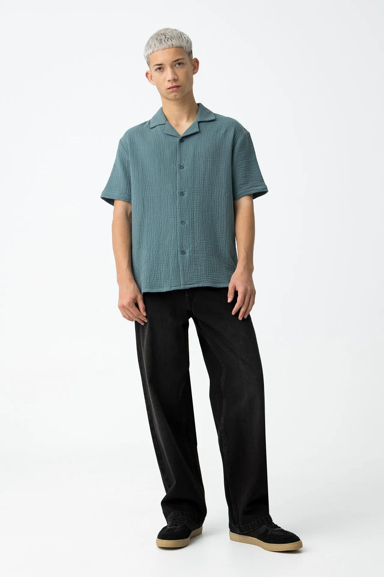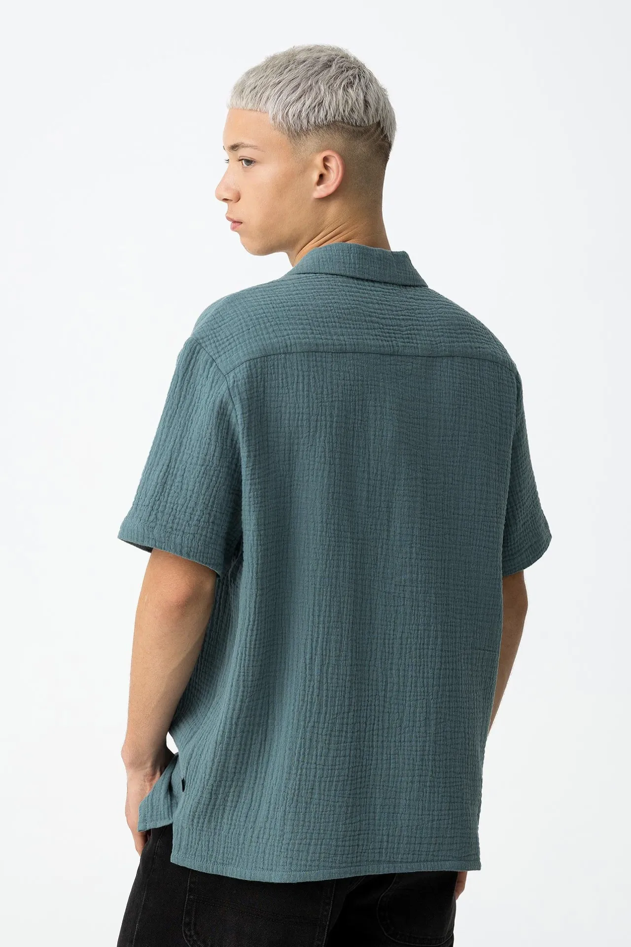 Esta camisa de cuello cubano y manga corta es una opción infalible para quienes buscan una prenda versátil con un toque de estilo veraniego. Su corte recto y su confección en tejido 100% algodón la convierten en una pieza ligera y suave al tacto, perfecta para el día a día. El cierre frontal de botones añade un detalle clásico que realza su diseño atemporal, mientras que el cuello abierto estilo cubano le aporta un aire desenfadado y moderno. Disponible en dos colores neutros —verde suave y crudo claro—, es una camisa que se adapta tanto a looks informales como a combinaciones más cuidadas.